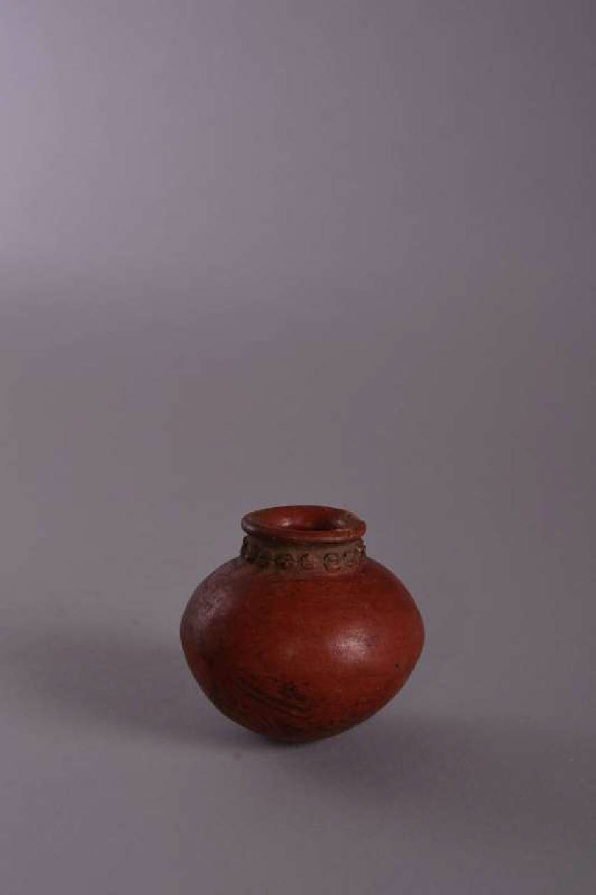 Anforetta con camera globulare, base convessa, superiormente breve collo con labbro arrotondato. Impasto medio - fine di colore crema. Ingobbio fine di colore rosso, tranne che sul collo. Esecuzione a paddling. La camera è divisa in due parti da una grande striscia di colore crema che corre lungo uno dei meridiani, ai lati di essa alcune linee parallele (tre da un lato e quattro dall' altro) delimitano motivi a spirali e a triangoli realizati con tecnica al negativo. Il collo è decorato in bassorilievo con una teoria ininterrotta di sedici elementi a chicco di caffè applicati e incisi.