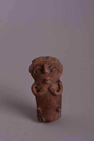 Statuina cava, a base piana quasi circolare con un largo foro al centro. Impasto medio - fine di colore mattone. Ingobbio fine colore mattone. Cottura ossidante. Esecuzione a mano libera e rifinitura a spatola. La statuina raffigura una figura femminile piuttosto stilizzata con un copricapo semilunato. Essa presenta occhi a chicco di caffè, sopracciglia molto accentuate, naso e labbro inferiore sporgenti, braccia filiformi e piedi appena accennati. Le mani sono appoggiate sul petto. La statuina ha due fori passanti sotto le ascelle.Si ritiene che tali figurine venissero usate nel corso di rituali domestici legati al ciclo vitale femminile.