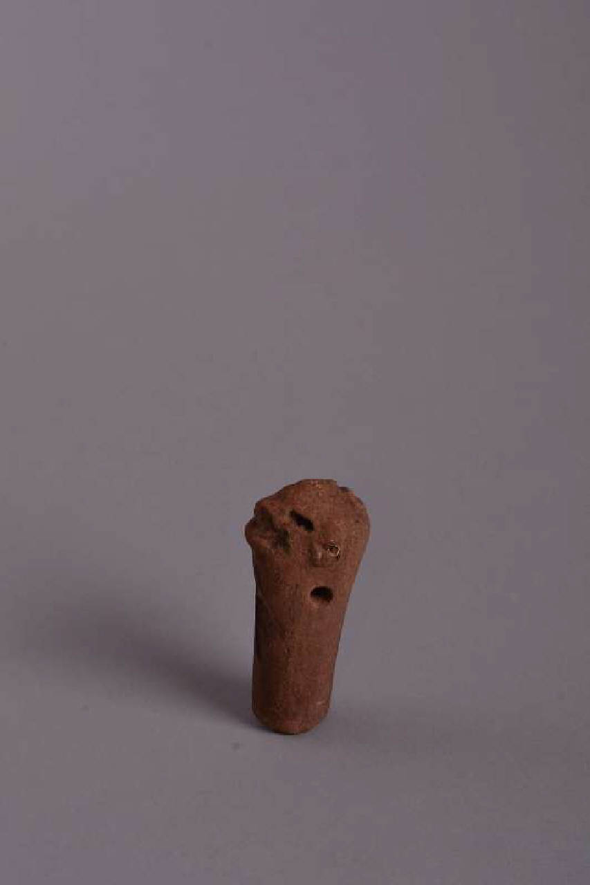 Manico di incensiere "a padella" che termina con la testa di una figura zoomorfa. Occhi, bocca e orecchie sono realizzati ad incisione, in modo molto grezzo. Impasto fine di colore mattone. Ingobbio fine color mattone con tracce di pirite. Cottura ossidante. Sotto la testa si trova un foro passante di areazione perpendicolare al piano della cresta.