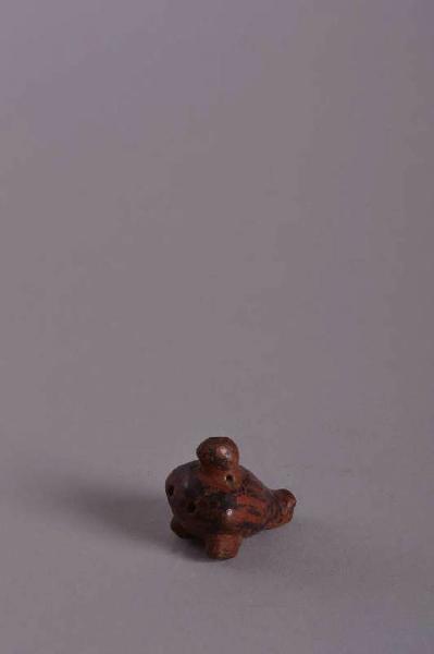 Fischietto ornitomorfo. Il manufatto raffigura un volatile non identificabile. Impasto medio - fine di colore mattone. Ingobbio molto fine colore mattone. Cottura ossidante. Esecuzione a paddling, rifinitura a spatola, levigatura molto accurata. Il fischietto, raffigurante un volatile, è decorato in bicromia con linee nere (le penne) su fondo mattone. Presenta un foro per l' entrata dell' aria, uno per la modulazione del suono e quattro per l' uscita.