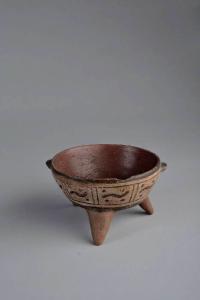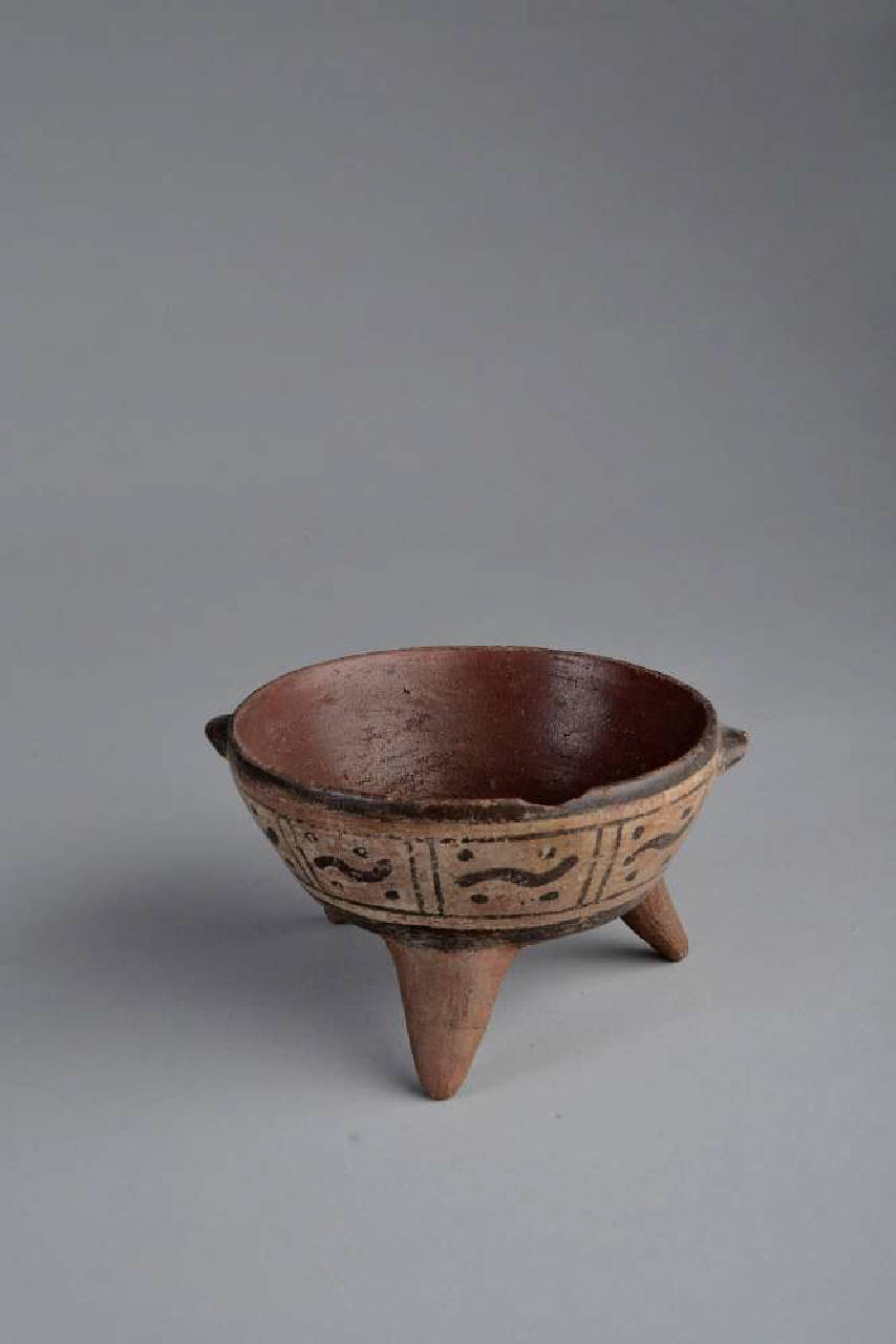Ciotola a tre piedi in terracotta a forma di tronco di cono rovesciato, fondo piano circolare, alette simmetriche situate presso il bordo. Impasto medio-fine color mattone. Ingobbio medio-fine color mattone-chiaro. Cottura ossidante con bruciatura o nube sul fondo esterno. Esecuzione mediante palettatura su un unico stampo, alette e piedi assemblati; rifinitura a spatola. La ciotola è decorata in quadricromia (rosso, mattone chiaro, marrone, crema). Il registro decorativo esterno; delimitato superioramente e inferioramente da una striscia orizzontale rossa, presenta otto volte un motivo a onda di mare contornato con quattro puntini e da linee orizzontali e verticali (marrone su crema). L'interno della ciotola è dipinto di rosso.