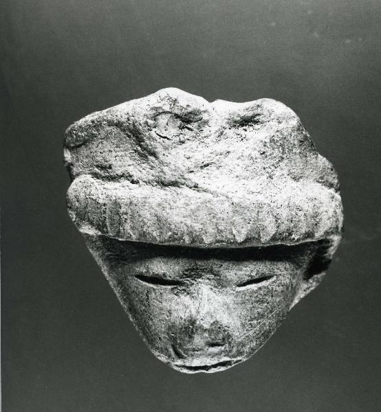 Testina di figurina fittile con occhi e bocca fessurati e complesso copricapo a turbante. Impasto fine di colore ocra (x 9 - 10, y 8 - 9). Ingobbio evanescente. Cottura ossidante.