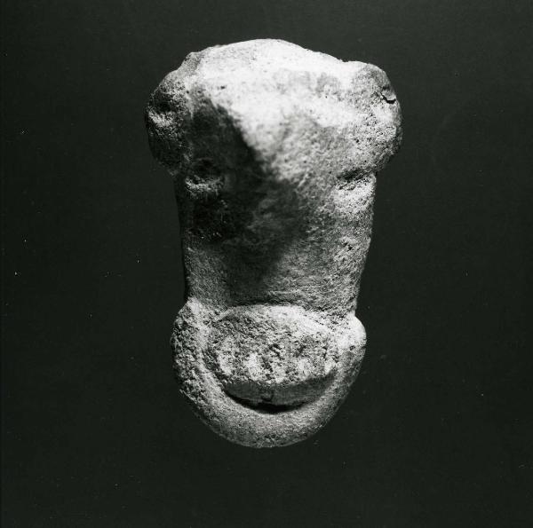 Testina di figurina fittile, convolto allungato, con la fronte ampia e larga, con orecchini, naso prominente, occhi appena accennati e un copricapo semilunato costituito da un ciuffo di penne e da un fascia di cotone imbottito. Impasto: 2.5 YR PALE RED 7/2, Ingobbio: 5 YR DARK GRAY 4/1, Cottura: Ossidante.