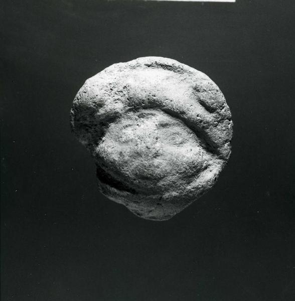 Testina di figurina fittile, con tratti somatici appena accennati, molto evidenti invece gli zigomi. E¿ visibile un unico occhio, il destro, il quale è in minimo riliervo, rotondo con un foro al centro. Il naso è dritto. COPRICAPO: Il copricapo a turbante è formato da due strisce imbottite e presenta sottogola; si osservano quelli che paiono due occhi nella parte superiore. Potrebbe rappresentare un guerriero di alto rango con elemento zoomorfo. Impasto: 5 YR REDDISH YELLOW 7/6 Cottura: Ossidante.
