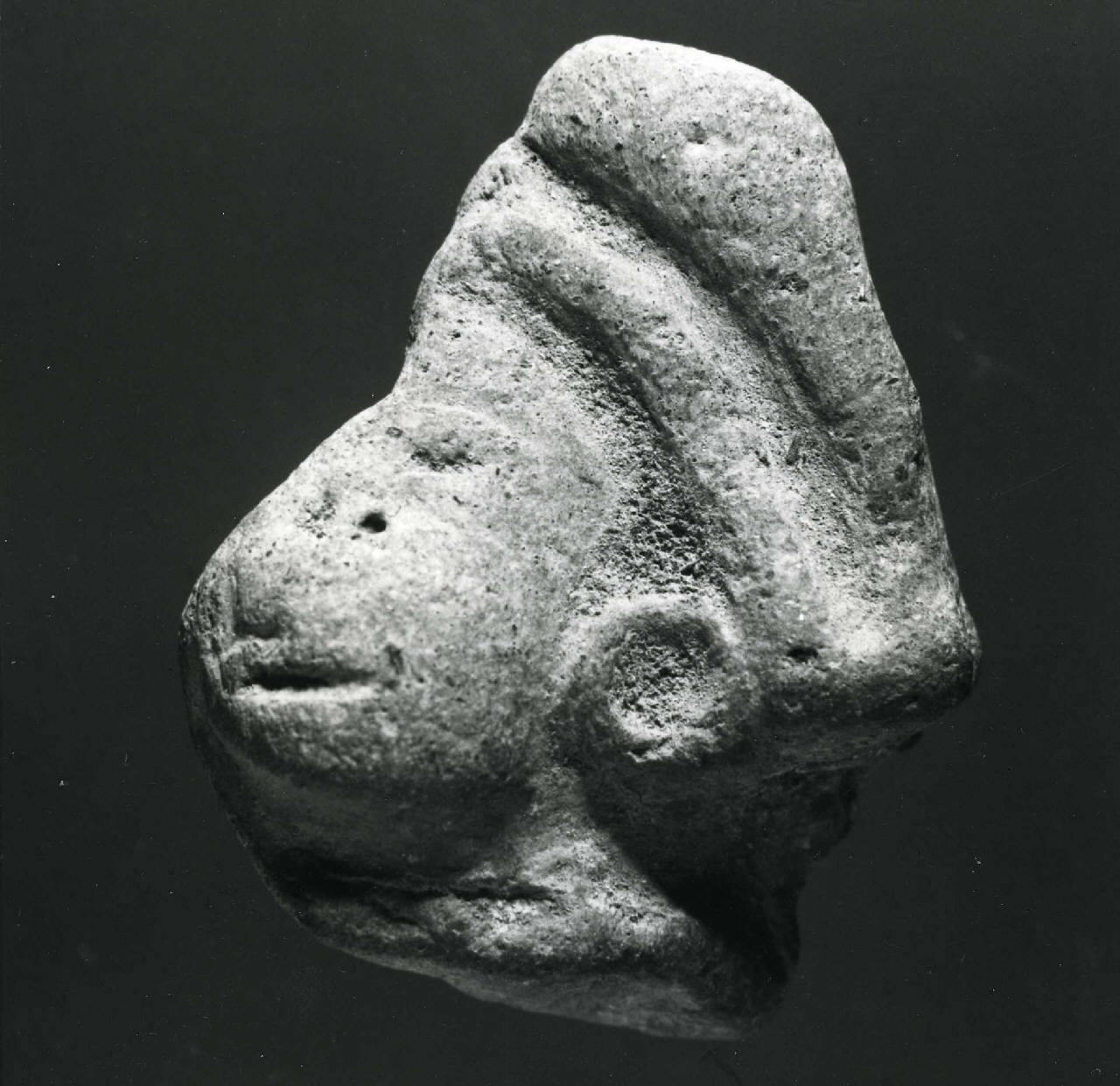Testina di figurina fittile, con viso ovale, del quale si è persa la parte superiore sinistra. Il solo occhio visibile è piccolo ed in rilievo Del naso non sono visibili che i fori delle narici. La bocca è disegnata mediante un¿incisione lineare. E¿ visibileparte del copricapo semilunato costituito da un doppio cordone. E¿ visibile un orecchino ad anello e un frammento di collana. La figurina è riferibile alla tipologia I-A, corrispondente a donne a seno scoperto, con gonna a losanghe, identificate con la dea della fertilità Coatlicue-Cihuacoatl. Impasto: 5 YR GRAY 5/1 Ingobbio: 2.5 YR LIGHT REDDISH BROWN 6/3 Cottura: Ossidante.