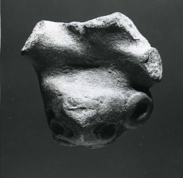 Testina di figurina con occhi punzonati, bocca fessurata, grande naso e orecchini circolari. Forse si tratta di un essere antropo-zoomorfo. Impasto fine di colore ocra chiaro - mattone chiaro (x 9 - 10, y 12 - 13). Ingobbio fine, evanescente di colore ocra chiaro - mattone chiaro (x 9 - 10, y 12 - 13). Cottura ossidante.
