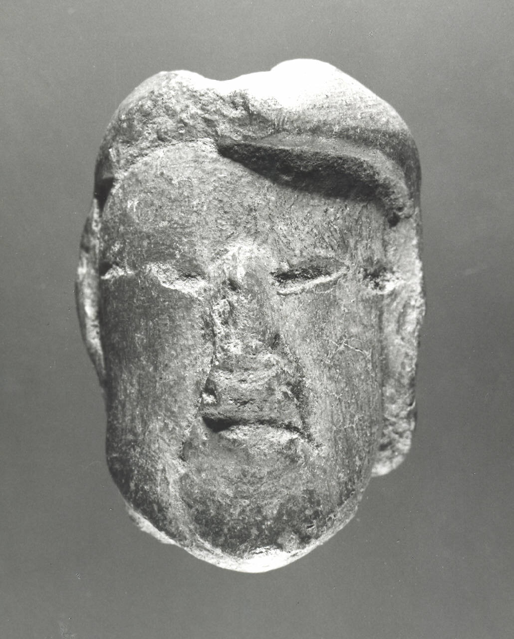 Testina di figurina fittile. l frammento raffigura la testa di un personaggio dai tratti olmecoidi, con occhi fessurati e copricapo (o capelli) sporgente in avanti. Impasto medio di colore ocra (x 9 - 10, y 12 - 13). Ingobbio fine di colore mattone scuro (x 12, y 4). Cottura ossidante. L'ampia diffusione di figurine di questo stile impedisce una precisa attribuzione geografica.