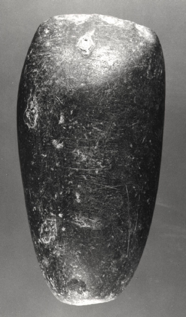 Accetta in basalto di color nero, a forma sub trapezioidale, bifacciale, sezione piano-convessa, tallone retto, tagliente leggermente obliquo, levigatura abbastanza curata.