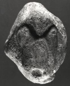 Testina di figurina fittile. Il frammento raffigura la testa di un personaggio del quale è possibile riconoscere solo tracce dela bocca e degli occhi e un copricapo a V sporgente in avanti (o si tratta di sopraccigli molto accentuati ?). Impasto medio - fine di colore ocra chiaro - mattone chiaro (x 9 - 10, y 12 - 13). Ingobbio evanescente di colore mattone scuro (x 12, y 2). Cottura ossidante.