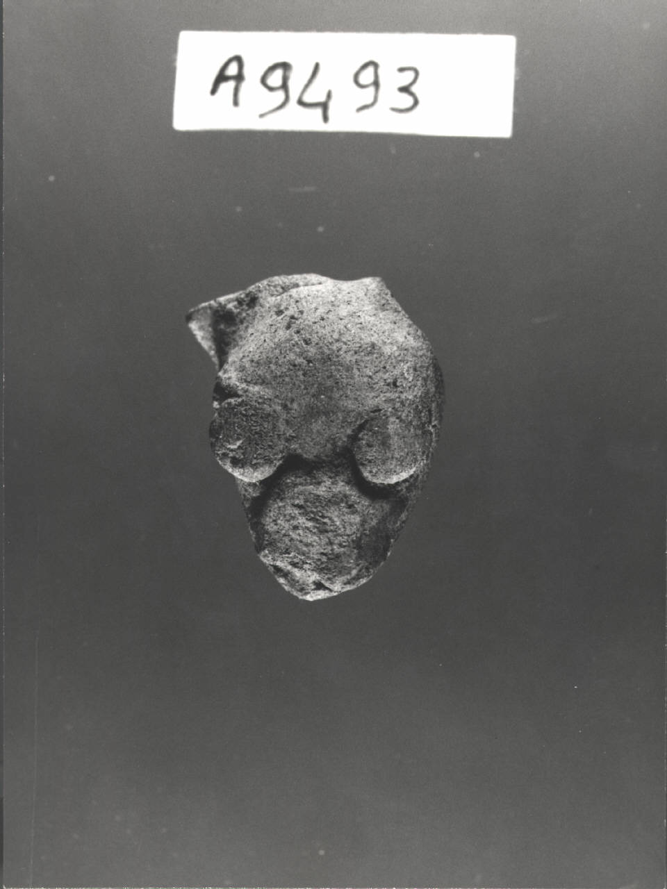 Testina di figurina fittile zoomorfa. La figurina rappresenta un cane dal muso corto; la fronte ed il resto della testa è tondeggiante e si nota un resto di orecchio sinistro. Gli occhi sono molto grandi e di forma sferica, essi sono estremamente in rilievo; si intravedono, soprattuttto a sinistra, i segni in rilievo delle palpebre. La bocca è aperta e resa mediante un¿incisione. Impasto: 7.5 YR PINK 8/3. Cottura ossidante.