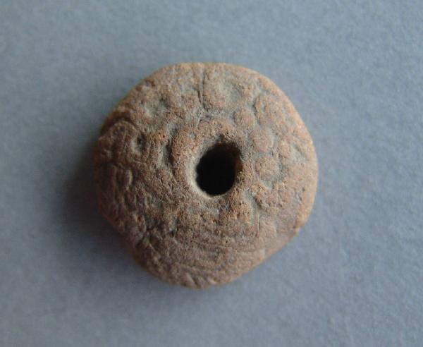 Fusaiola fittile tronco - conica, base piana, con foro centrale, passante, cilindrico. Iconografia non leggibile. Impasto medio - fine di colore ocra chiaro - mattone chiaro (x 9 - 10, y 11). Ingobbio evanescente. Cottura ossidante.