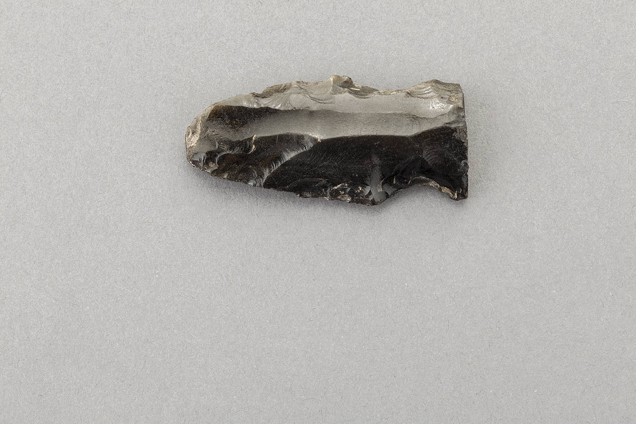 ossidiana verde/ scheggiatura a percussione/ ritocco a pressione