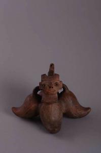 Bottiglia con quattro camere a forma di peperone, raccordo ventrale cilindrico, superiormente, su due delle camere opposte, un ponte orizzontale cavo, da cui emergono un versatoio tronco - conico ed un elemento cefalomorfo uniti da un manico a ponte a sezione ovoidale. Cottura ossidante. Impasto medio di colore marrone (x 10, y 6). Ingobbio fine di colore mattone scuro (x 11, y 6). Le camere sono state eseguit a stampo, gli altri elementi, eseguiti a stampo (ponte) e a mano libera, sono stati assemblati successivamente. Rifinitura a spatola e per incisione. La bottiglia, dipinta in negativo, è decorata in bicromia (marrone (x 11, y 6) e nero (x 1, y 1)), con motivi geometrici (puntini, linee continue, a zig - zag, a pettine, semicirconferenze con al centro un puntino). Dal ponte orizzontale emerge la testa di un personaggio con un copricapo bipartito (simile a quelli della costa sud) e con quattro fori negli occhi e nelle narici.