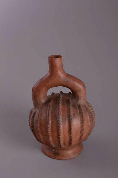 Bottiglia con camera globulare, base tronco - conica cava, superiormente un'ansa a staffa centrale cava a sezione circolare sormontata da un versatoio cilindrico. L'asse della bottiglia è inclinato di circa 7°- 8° rispetto alla verticale. Cottura ossidante con "nubi" grigie e nere. Impasto medio di colore ocra e ingobbio fine dello stesso colore. La camera è stata eseguita a colombino, l'ansa è stata assemblata successivamente. Rifinitura a spatola e per incisione, levigatura accurata. La camera della bottiglia è decorata in bassorilievo e con cordoni verticali che seguono in linea di massima l'andamento dei meridiani e sembrano rappresentare un motivo fitomorfo, forse le carenature di una zucca. I gomiti dell'ansa presentano due rilievi circolari.