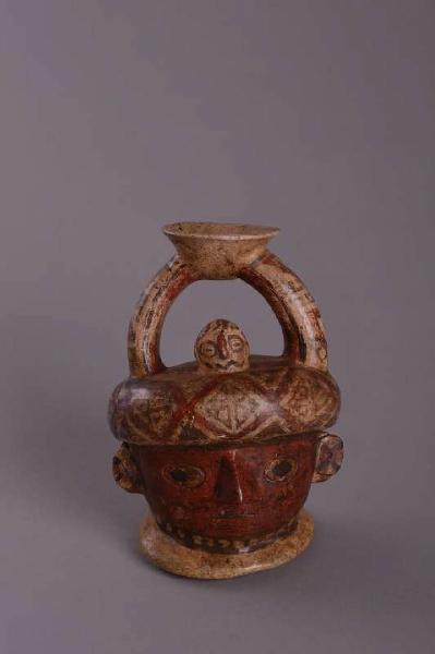 Bottiglia antropomorfa in terracotta con camera pseudo-cilindrica, basamento tronco-conico. Nella parte superiore c'è un'ansa ogivale, cava, a sezione circolare, sormontata da un largo versatoio tronco-conico. La bottiglia raffigura la testa di un personaggio di rango.