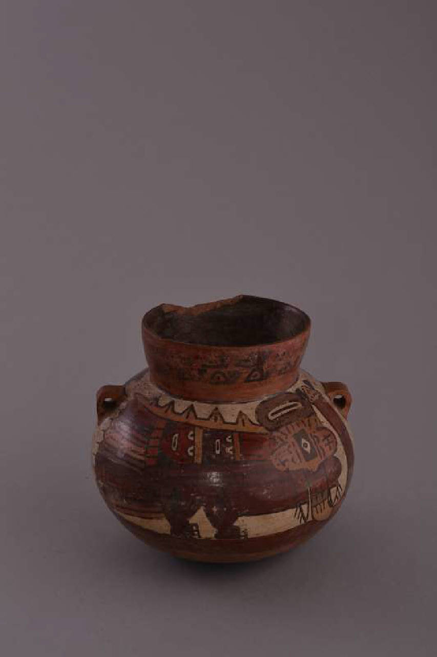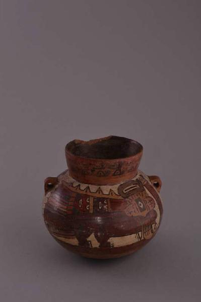 Olla in terracotta a sezione circolare, base leggermente convessa, largo collo ingrossato, sulle spalle occhielli passacorda simmetrici con incisioni all'interno. Cottura ossidante con nubi nere sulla base. Impasto fine di colore ocra chiaro [x 9, y 11]. Ingobbio molto fine di colore ocra [x 9, y 9]. Esecuzione a paddling o a falso tornio, manici e collo (?) assemblati successivamente. Rifinitura a spatola e a pennello, levigatura moòto accurata. Un restauro dissimulato ha saldato due linee di frattura sul collo. Sulla camera dell'olla, decorata in policromia (bianco [x 8, y 14], grigio [x 1, y 7], ocra chiaro [x 9, y 13], ocra [x 9, y 7], mattone scuro [x 12, y 2], nero [x 1, y 1]) è dipinta una divinità nasca ornitomorfa, una delle manifestazioni dell'Essere Mostruoso, la cui testa, rivolta verso l'altro, presenta una bocca antropomorfa e una grande nariguera. Il viso, di profilo (?), è coperto da teste-trofeo dalle quali escono due elementi conici (vegetali ?) ed un secondo corpo serpentiforme che termina con una testa-trofeo. Il corpo della divinità presenta due teste-trofeo e i simboli dell'impennatura. Il collo dell'olla è decorato da due teorie sovrapposte di uccelli stilizzati.