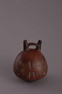 Bottiglia a due beccucci di color marrone. Il corpo globulare, rossiccio, è decorato con l'essere mostruoso con due appendici terminanti in teste trofeo (?).