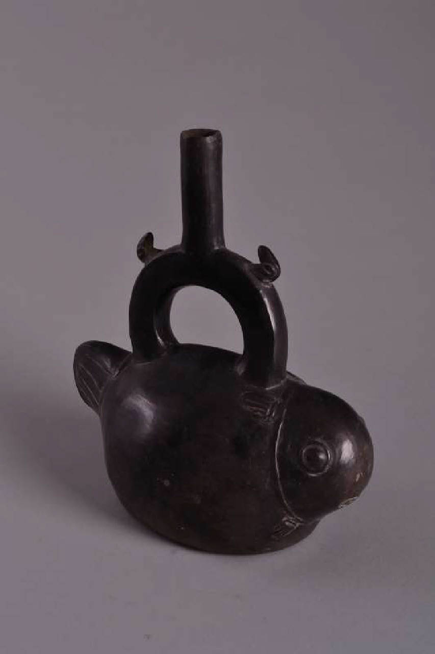 Bottiglia zoomorfa. La parte frontale ritrae un animale che assomiglia a un leone marino ma la coda è da pesce. Due teste di uccellini sul manico a ponte che sembrano attaccate posteriormente (si veda le notizie storico critiche).