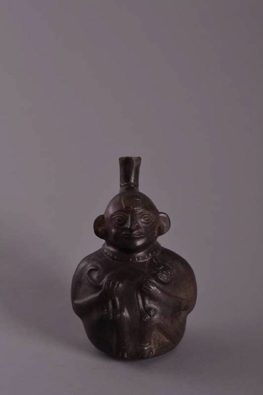- NOTIZIE STORICO CRITICHE Secondo Susan Bergh (Cleveland Museum of Art) che ha visionato l'oggetto in data 19/06/2018 la forma degli occhi del personaggio hanno tratti caratteristici sican, mentre il manico della bottiglia e il pennacchiuo sulla fronte sembrerebbero moche. Potrebbe trattarsi di un pezzo di transizione moche-sican. Da una ricerca effettuata da Carolina Orsini nell'archivio digitale della collezione Larco di Lima, esiste un esemplare simile (si veda scheda allegata nella documentazione).