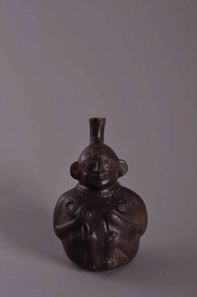 Bottiglia antropomorfa con ansa a staffa che raffigura un personaggio che mastica della coca (bolo nella guancia destra) con grandi orecchini. Seduto con un animale in braccio (felino). A rilievo una sorta di contenitore piatto sulla schiena (borsa per la coca?). Forma degli occhi allungata, pennacchio sulla fronte.