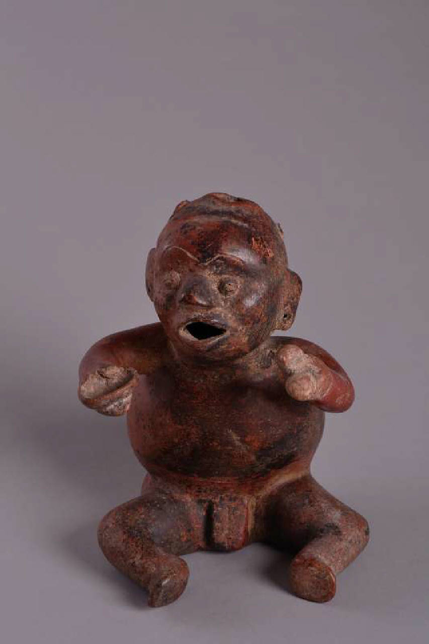 La figura raffigura un gobbo seduto che tiene due elementi globulari nelle mano sinistra e una ciotola nella mano destra. La bocca è aperta e le gambe hanno una forma geometrica tondeggiante. La rappresentazione di nani è frequente nella ceramica Colima di stile Comala. Sovente i nani sono anche affetti da altre malformazioni o patologie, come in questo caso dove l'individuo presenta una gobba e due creste a sciabola sopra le orecchie che potrebbero essere traccia della sifilide congenita. I due elementi globulari nella mano sinistra potrebbero essere "bottoni" di peyote o maracas. Comunque l'individuo, probabilmente in qualità di servitore o attendente, pare impegnato in una scena di presentazione di elementi usati in un rituale di trasformazione che prevedeva l'ingestione di sostanze psicoattive come una bevanda alcolica (probabilmente un fermentato di agave) e, forse, peyote. Ceramica con Ingobbio rosso scuro. Cottura ossidante.