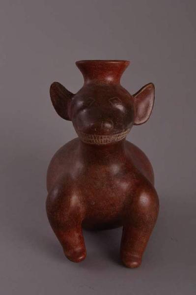 Figura fittile zoomorfa comala che raffigura un cane seduto sulle zampe posteriori. Le rappresentazioni di cani sono frequenti nell'arte Colima di stile Comala. Simili cani erano allevati per ragioni alimentari, ma la loro raffigurazione in figure usate come offerte funeraie potrebbe derivare dalla diffusa concezione mesoamericana secondo la quale un cane aiuta il defunto a superare un corpo d'acqua ubicato nel mondo dei morti. Ceramica con Ingobbio di colore rosso scuro. Cottura ossidante.