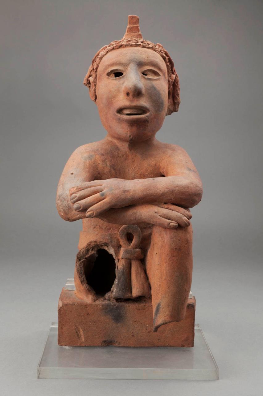 Figura maschile seduta con le braccia sulle ginocchia. Indossa un perizoma (maxtlatl) e un copricapocomplesso costituito da un elemento centrale costituito da tre elementi quadrangolari sovrapposti, da una sorta di cuffia, da due elementi circolari che sormontano le orecchie e da una banda pendente lungo la schiena. La figura potrebbe rappresentare un giovane guerriero o un impersonatore di divinità . Impasto arancio. Cottura ossidante.