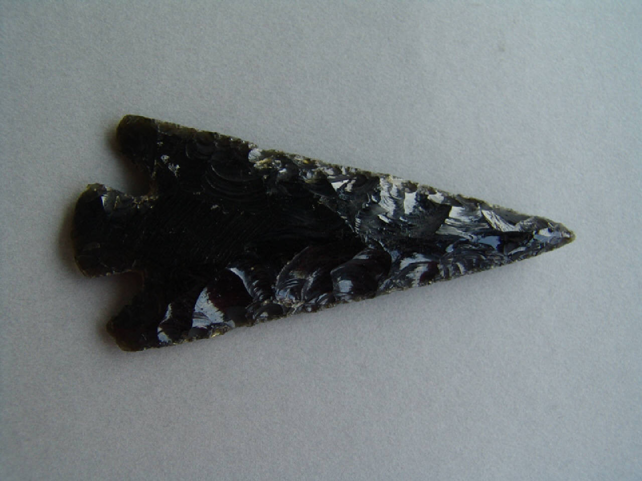 Punta di zagaglia in ossidiana, di forma triangolare peduncolata. La tecnica di fattura suscita qualche dubbio sull'autenticità dell'oggetto.