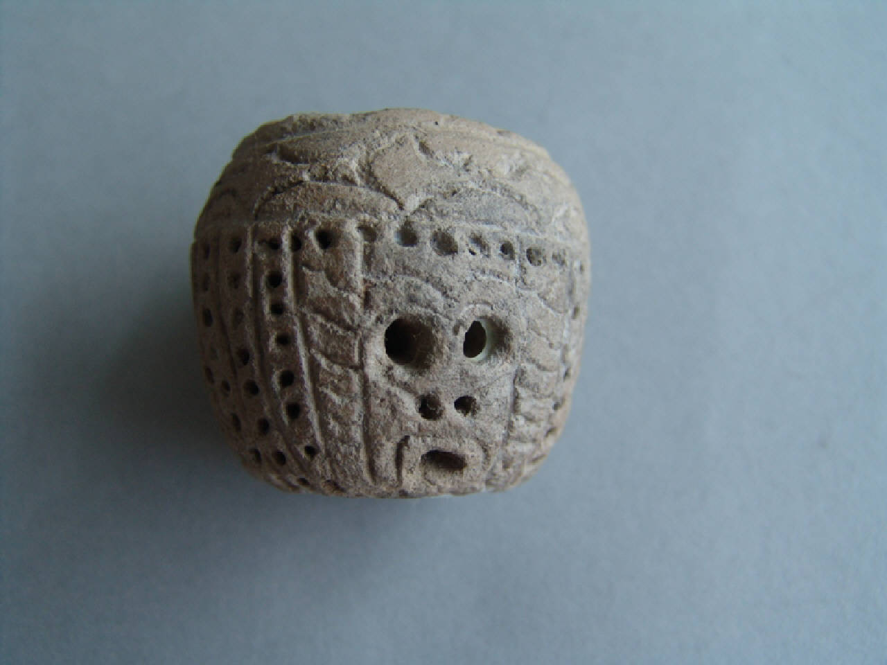 Piccolo vasetto in miniatura di forma globulare, con decorazione punzonata e incisa a formare un volto con copricapo. La forma degli occhi e del naso suggerisce che si tratti di una raffigurazione di una scimmia. Impasto grigio-beige. Cottura ossidante.