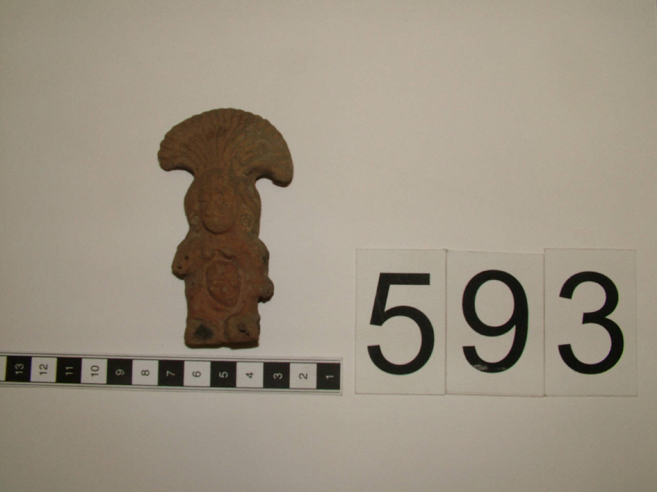 Figurina fittile antropomorfa raffigurante un personaggio stante con grande copricapo piumato. L'uomo tiene le braccia sul petto sostenendo un volto umano, forse una maschera o una testa trofeo.