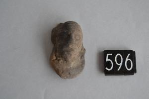 Testina di figurina fittile antropomorfa con naso prominente, naso schiacciato e occhi ellittici. Sulal fronte si osserva un copricapo costituita da fasce orizzontali.
