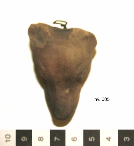 Testina di figurina fittile zoomorfa che raffigura un canide. Il muso è allungato, con occhi in rilievo, a mandorla. Il naso non è più leggibile perchè molto consunto.La bocca è resa tramite un¿incisione. Dal naso partono, due per lato, delle incisioni forse pieghe o rughe. Impasto arancio-rossiccio. Cottura ossidante.