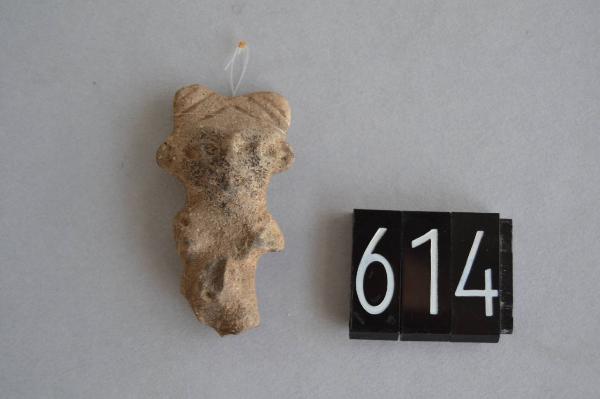 Figurina fittile antropomorfa. Raffigura una donna con occhi ellittici, piccolo naso e bocca minuta. Sul capo, due protuberanze laterali decorate da linee incise oblique, paiono raffigurare un'acconciatura.