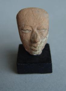 Testina di figurina fittile con individuo dal volto subtriangolare, con deformazione cranica, naso prominente, occhi ellittici e bocca sporgente.