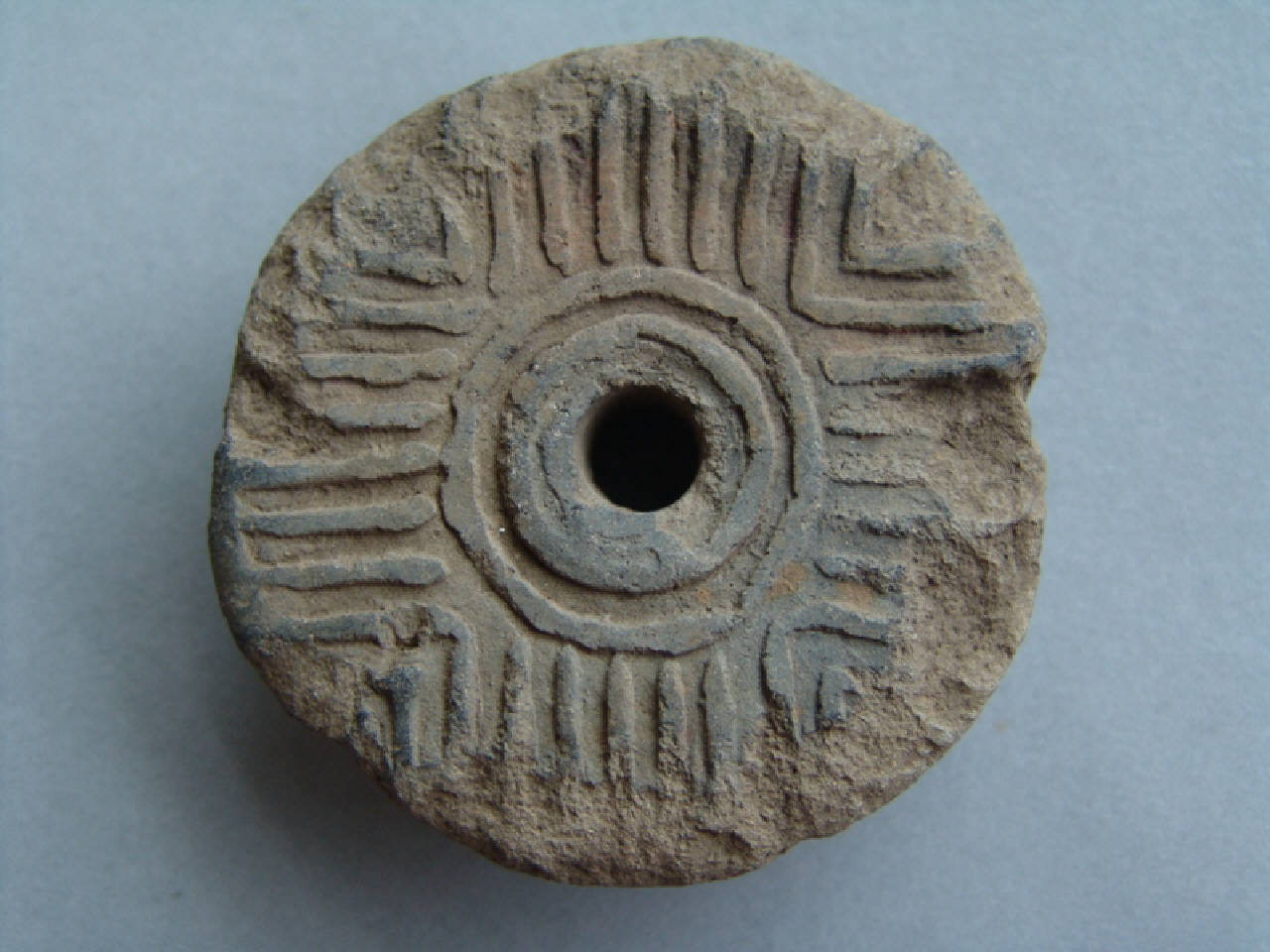 Fusaiola tronco-conica con decorazione geometrica a stampo, con cerchi centrali attorno al foro, dai quali si diparte un motivo cruciforme composto da linee parallele.