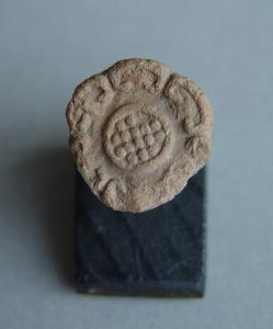 Timbro fittile con impugnatura conica. Il timbro raffigura un elemento floreale: al centro si osserva un cerchio puntinato circondato da petali.