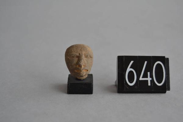 Testina di figurina fittile antropomorfa. Il viso è ovale, con il mento appuntito, non presenta capelli. Gli occhi sono fessurati, con sopracciglia appena disegnate tramite incisione e palpebre in rilievo. Il naso è lungo con narici strtte e ben visibili. La bocca è fessurata con labbra appena in rilievo. Impasto: 5 YR DARK GRAY 4/1 Ingobbio: 5 YR PINK 7/3