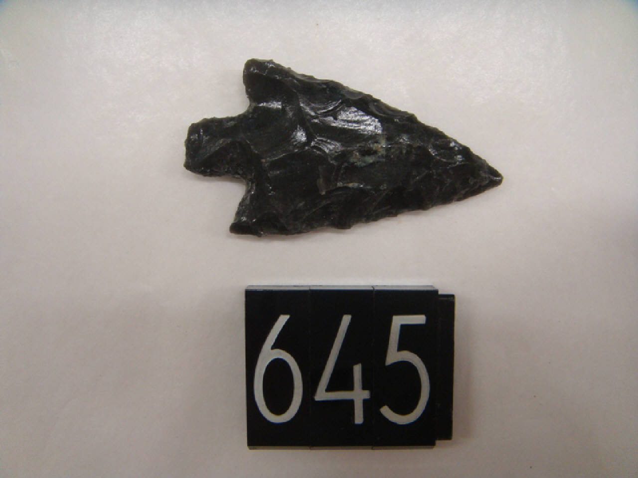 Punta di lancia bifacciale in ossidiana, di forma triangolare, con peduncolo retto, tacche laterali, base retta, seghettatura continua lungo i bordi.