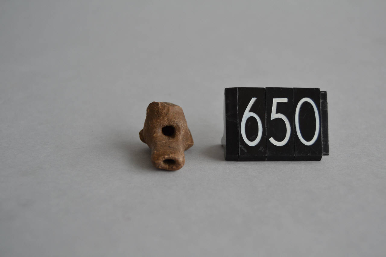 Fischietto fittile. Il fischietto ha un foro aperto all'apice di una parte lunga e stretta, fessurata all'interno; nella parte in cui si allarga sono stati praticati due fori di forma grossomodo quadrata. Impasto: 2.5 YR LIGHT RED 7/6; Ingobbio: 5 YR DARK REDDISH GRAY 4/2.