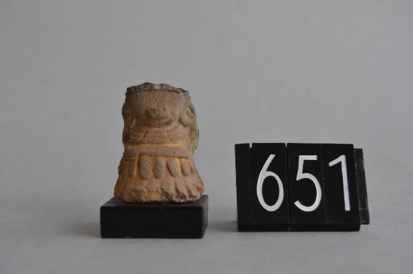 Testina di figurina fittile antropomorfa. Il viso ovale è privo di tratti, con un rettangolo in rilievo in corrispondenza della bocca che forse rappresenta un ornamento nasale. E¿ visibile la base del copricapo. La figurina presenta orecchini ad anello con elemento centrale circolare in rilievo; porta tre fili di collane formate da tre lunghe porzioni di terracotta suddivise da due incisioni verticali. La figurina porta una tunica probabilmente di piume. La figurina presenta tracce di pittura gialla su veste e collane e pittura tinta bianca sul copricapo; Impasto: 2.5 YR DARK REDDISH GRAY 3/1 Ingobbio: 2.5 YR RED 5/6