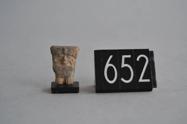 Figurina fittile antropomorfa stante, raffigurante un personaggio con copricapo quadrangolare, veste elaborata e orecchini circolari. Impasto: 2.5 YR PALE RED 7/2 Cottura: Ossidante.