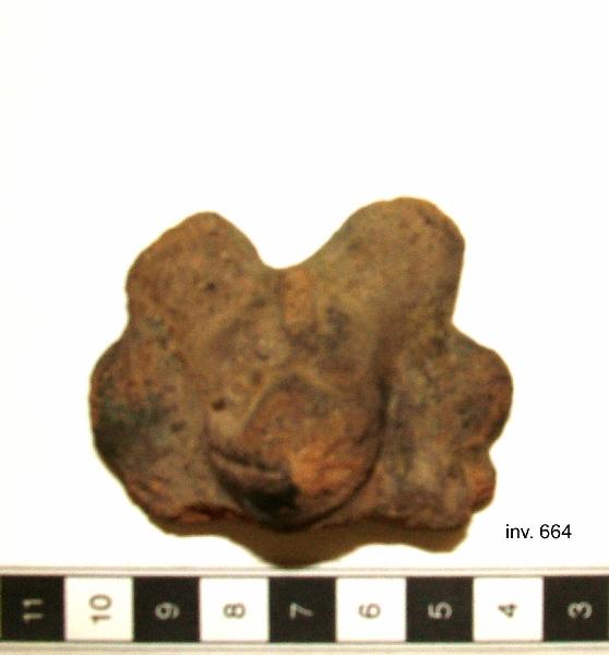 Frammento di figurina fittile ornitomorfa. Gli occhi presentano pupilla e contorni in rilievo. Il becco è scarsamente leggibile, ma presenta un¿incisione centrale che divide la parte inferiore da quella superiore. Presenta un ricco piumaggio intorno alla testa, bipartito da una cresta sagittale di cui rimane solo un frammento di base sulla fronte.