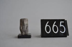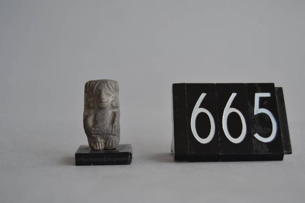 Figurina fittile antropomorfa. Il viso presenta i tratti quasi illeggibili. Gli occhi sono in rilievo. Il naso è in rilievo. La figurina presenta un copricapo bilobato con varie spire e al centro un semplice triangolo. La figurina porta orecchini ad anello con punzonatura centrale. Il corpo è nudo con la mano sinistra appoggiata al ventre e l¿altra distesa sul fianco. Mani e piedi hanno le dita rese mediante incisioni. Ingobbio: GREY DARK GRAY 4/N Cottura: Ossidante.
