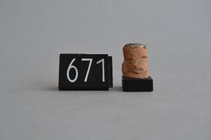 Testina id figurina fittile antropomorfa. Il viso è di forma squadrata, rettangolare, ha la fronte molto ampia. Gli occhi sono fessurati e molto lunghi, fino al bordo del viso. Il naso è mutilo. La bocca è fessurata e aperta, con le labbra disegnate. Il labbro inferiore è carnoso, quello superiore appena accennato. Sul lato sinistro del capo presenta un frammento, forse di copricapo o di orecchino, di forma ovale allungata verso il basso.Sul capo presenta una macchia grigio nerastra. Impasto: 7.5 YR DARK GRAY 4/1 Ingobbio: 5 YR REDDISH YELLOW 6/6 Cottura: Ossidante.