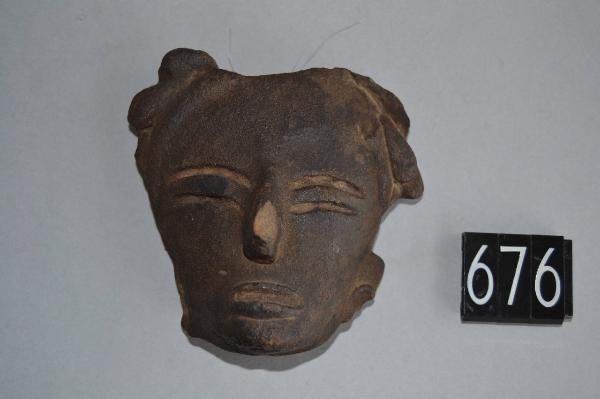 Testa di figura fittile antropomorfa. Il volto è subtriangolare, con naso prominente e labbra sporgenti. Gli occhi e le sopracciglia sono realizzati mediante incisioni. Si osservano resti di uno degli orechini circolari, nonché di un copricapo o acconciatura che si diparte dai due lati del capo rasato. Impasto beige. Cottura ossidante.
