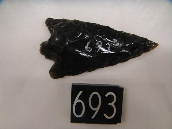 Punta di lancia bifacciale in ossidiana, di forma triangolare, a tacche angolari, con peduncolo appuntito.