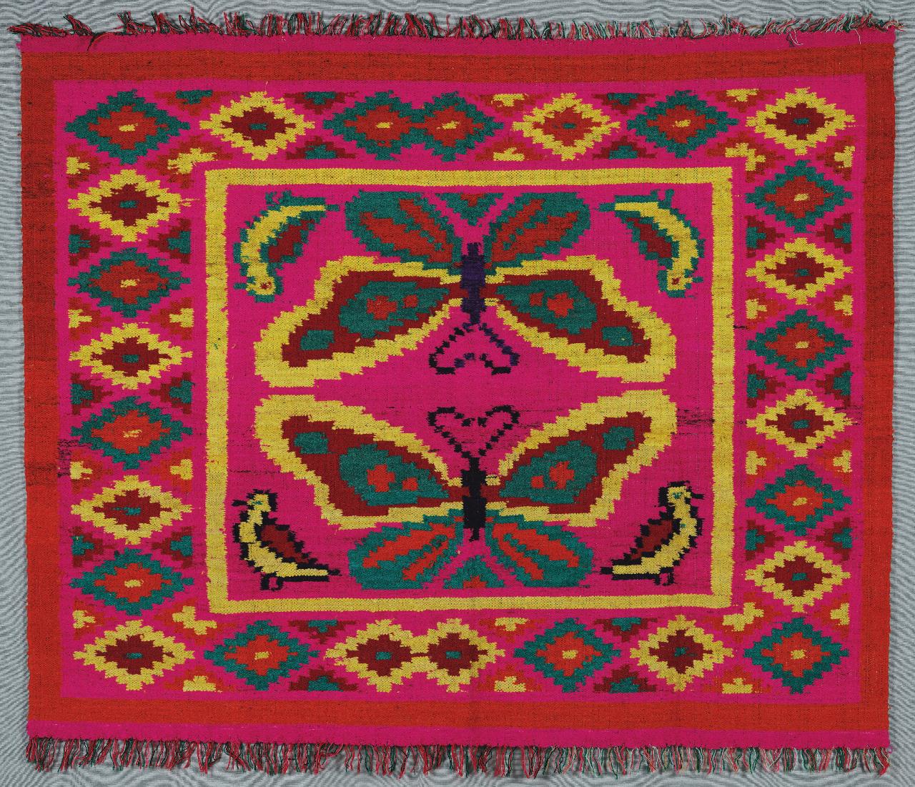 Coperta nuziale. Disegni geometrici e due grandi farfalle nel riquadro centrale.