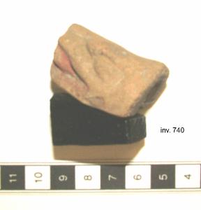 Testina di figurina fittile zoomorfa, con muso allungato, disegnato con tratti precisi e geometrici. La figurina pare rappresentare un felino, forse un puma. Gli occhi sono ricavati tramite incisione a mandorla specularmente posti ai lati del muso e sormontati da una sporgenza che, incorniciati gli occhi, forma un angolo retto e dà forma al naso. Il naso si presenta di forma rettangolare con un lato aperto, quello in direzione dell¿apice della testa. La bocca è aperta e si intravede la lingua; la bocca è resa tramite incisione, la lingua e le labbra sono in rilievo. La parte della bocca presenta tracce di pigmento rosso.