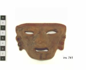 Volto fittile da applicare a un incensiere teatro. E¿ di forma triangolare, con il mento quadrato. Gli occhi sono formati dai contorni in rilievo che incorniciano un foro a mandorla, gli occhi sono leggermente inclinati in diagonale verso il naso. Il naso è ben modellato, la radice sottile e la base abbastanza larga, è dritto e appuntito in punta. La bocca ha origine appena sotto le narici, è aperta e le labbra sono carnose. Complessivamente le proporzioni del volto sono alterate, molto più largo e schiacciato del normale. Presenta un¿acconciatura sdopra la fronte formata da una sottile banda ed una decorazione a torciglione il tutto dipinto con un pigmento rosso.L¿acconciatura a torciglione scende ai lati del viso e termina con tre sfere anch¿esse dipinte di rosso. Impasto: 2.5 YR LIGHT RED 7/8 Cottura: Ossidante.