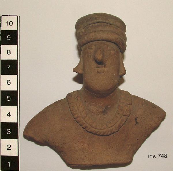 Figurina fittile antropomorfa. Il viso è ovale molto allungato; presenta un mento rotondo che fa tutt¿uno con il collo. Gli occhi sono fessurati, molto piccoli e ravvicinati, con palpebre appena in rilievo. Il naso è un appliquè, posizionato in alto ed aquilino, molto lungo e sottile; le natici sono inesistenti. La bocca è piccola con labbra ad appliquè in rilievo ed aperte. Il collo è massiccio ma ben proprzionato. Ciò che resta del corpo della figurina è il busto, liscio senza nè ornamenti nè incisioni; dai frammenti della parte superiore delle braccia si può intuire che esse erano aperte. Gli ornamenti sono degli appliquè e consistono in una collana realizzata a spina di pesce. Il copricapo è a turbante formato da tre strisce semplici sovrapposte: due a sezione rotonda e più sottili, la terza a sezione rettangolare e più larga; due bande, ad appliquè, le escono lateralmente al viso fino all¿altezza della bocca. Dietro la testa presenta una lunga coda che arriva fino alle spalle.